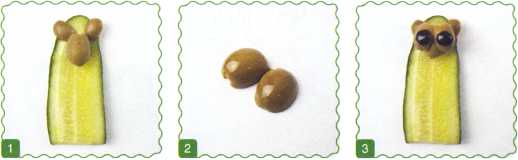 1. Отрезать от кусочка огурца тонкий ломтик. От оливки отрезать 2 овальных ломтика уши. Уложить уши на огурец, выложить вторую оливку.