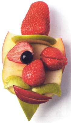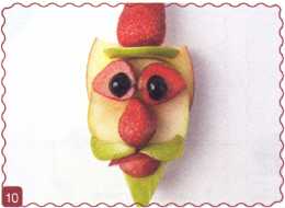 4. Уложить на него половинку ягоды клубники шапочку. Сверху положить маленький ломтик это лицо. Из дольки зеленого яблока сделать поля шляпы.