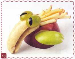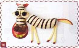 9. Вторую половинку банана выложить в виде туловища зебры. Сделать полоски из кожуры винограда.