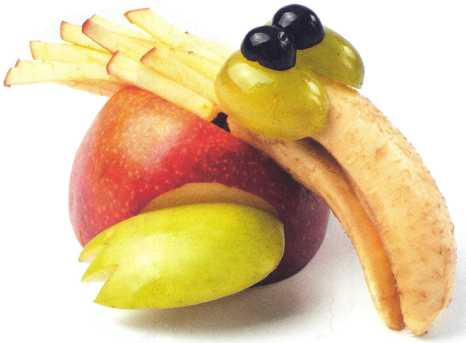 5. От второй половинки яблока отрезать ломтик и нарезать полосками это перья. Уложить их в верхний вырез в виде хвоста.