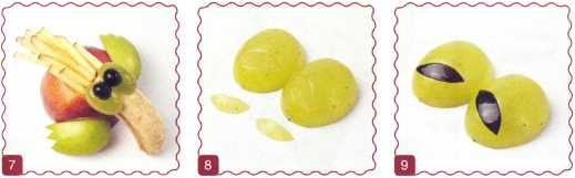 8. Можно сделать глаза с прищуром. Для этого из половинок ягоды винограда вырезать небольшие щели.