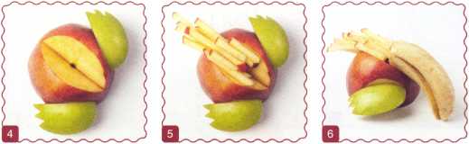 5. Из ломтика яблока вырезать уши и вставить в надрез. Уложить голову на мордочку.
