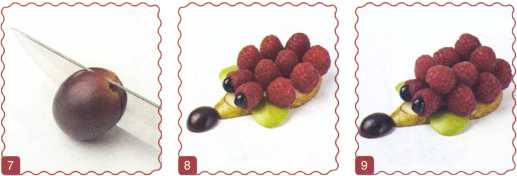7. Ягоду винограда разрезать вдоль пополам это глаза. Зрачки сделать из половинок ягоды черники.