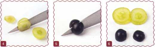 4. От ягоды винограда отрезать кончики, среднюю часть разрезать пополам, не разрезая кожицы.