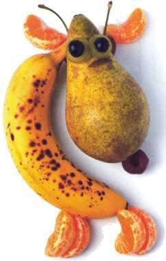 8. Ягоду винограда надрезать поперек, не дорезая до кожуры. Развернуть половинки ягоды и уложить на мордочку это нос. Вырезать зубы из кожуры зеленого яблока.