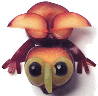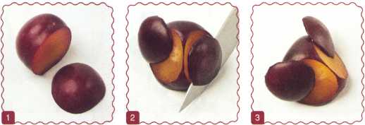 1. От сливы отрезать ломтик и уложить срезом вверх это голова птички.