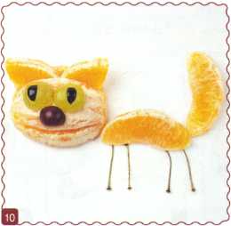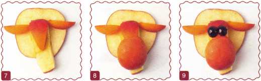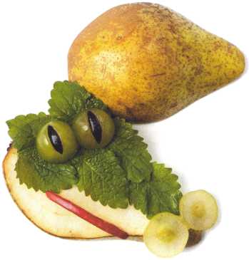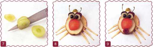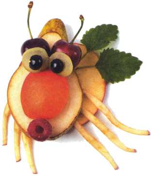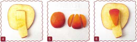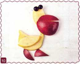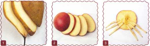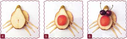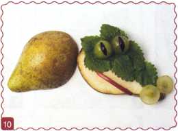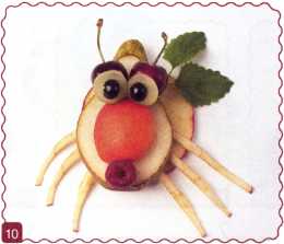 10. Из кусочка красного яблока вырезать рот. Выложить туловище ломтик груши.