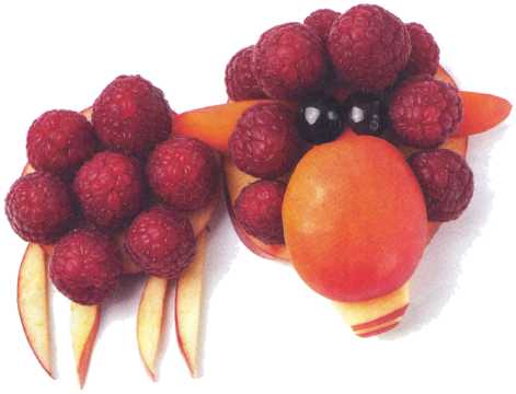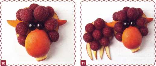 11. Выложить оставшийся ломтик яблока туловище и уложить на него ягоды малины. Из тонкого ломтика яблока вырезать ножки.