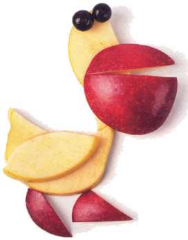 1. От яблока отрезать бочок и 2 ломтика. Меньший разрезать на 2 дольки. Маленькая долька это шея пеликана, большая голова. Большой ломтик яблока разрезать на овал и полумесяц крыло и туловище.