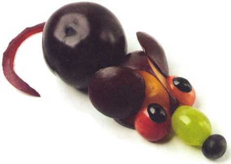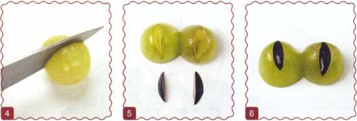 7. От ягоды винограда отрезать кончики, серединку разрезать пополам. Из ягоды черники вырезать зрачки и выложить на мордочку.