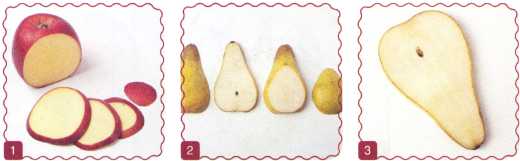 1. От красного яблока отрезать круглый ломтик кожуры и 3 тонких ломтика мякоти.