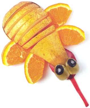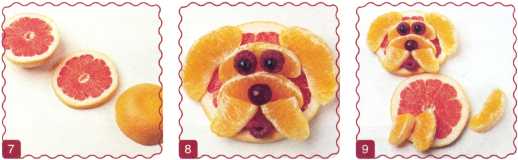 9. Выложить туловище еще один кружок грейпфрута. Ножки сделать из половинок дольки апельсина, хвост из целой дольки.