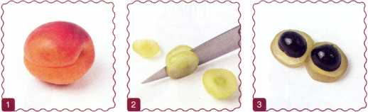 4. Ягоду винограда разрезать вдоль пополам. Одну из половинок разрезать на две части это глаза.