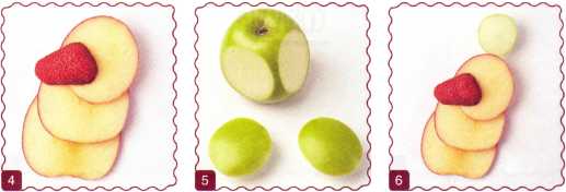 4. Срезать кожуру у ломтика яблока и уложить в виде хоботка. Сверху положить ломтик красного яблока.