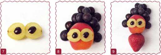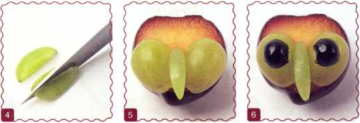 5. Ягоду зеленого винограда разрезать вдоль, не разрезая кожицы. Развернуть дольки и срезать на каждой из них круглые ломтики это глаза. Разрезать чернику пополам это зрачки.