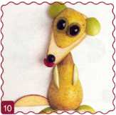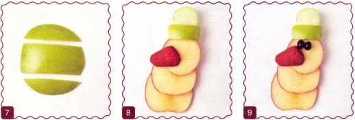 9. Выложить туловище большой крайний ломтик и хвост тонкий ломтик красного яблока.