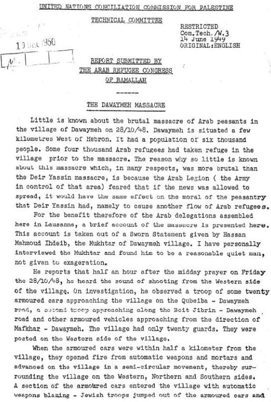 «Первая волна наступающих убила от 80 до 100 арабов, мужчин, женщин и детей. Детей они убивали, разбивая их головы палками. Не было ни одного дома, в котором не лежал убитый. Один командир приказал саперу впустить двух старух в один из домов и взорвать дом вместе с ними. Сапер отказался. Тогда командир приказал своим солдатам загнать туда старух, и злое дело было сделано. Один из солдат хвастался тем, что изнасиловал женщину, а потом застрелил ее. Одну женщину с новорожденным ребенком на руках заставили убирать двор, в котором ели солдаты. Она работала день или два. Потом солдаты застрелили ее и ее ребенка», рассказал один из боевиков .
