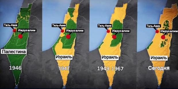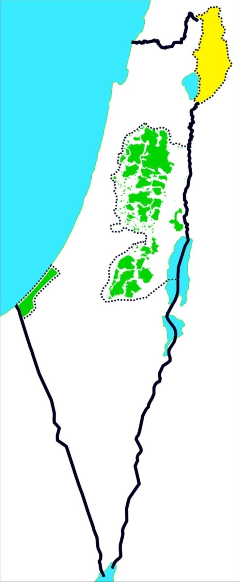 На Западном берегу, белым цветом помечены оккупируемые территории находящиеся под полным контролем Израиля, зелёным зоны которые полностью управляются палестинцами и Израилем и палестинцами совместно. Подробно ситуация сложившаяся сегодня в секторе Газа и на Западном берегу будет рассмотрена в соответствующих главах.