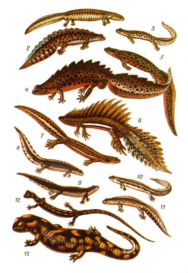 Хвостатые амфибии леса: 1 сибирский углозуб; тритоны: 2, 3 обыкновенный (соответственно самец и самка); 4, 5 гребенчатый (самец и самка); 6, 7 малоазиатский (самец и самка); 8,9 альпийский (самец и самка); 10, 11 карпатский (самка и самец); саламандры: 12 кавказская; 13 пятнистая