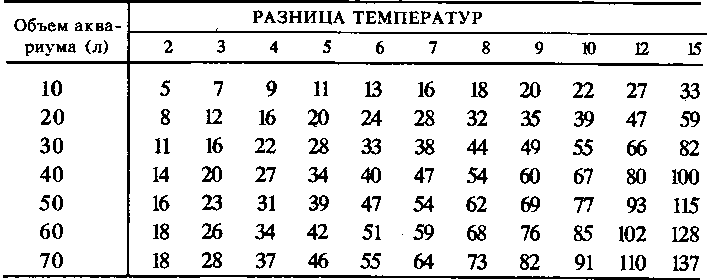 Мощность электронагревателя для повышения температуры воды в аквариуме относительно комнатной (Вт).