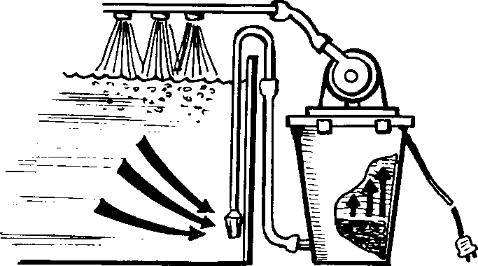 Менее эффективный фильтр работает с помощью воздуха, подаваемого компрессором в трубку небольшого диаметра. Пузырьки воздуха поднимаются по трубке вверх, увлекая за собой проходящую через фильтр воду. Такие фильтры называются аэролитными. Фильтрующими материалами служат синтетическая вата (но не стеклянная), обрезки капроновой ткани, песок. Фильтры необходимо регулярно очищать от грязи и заменять