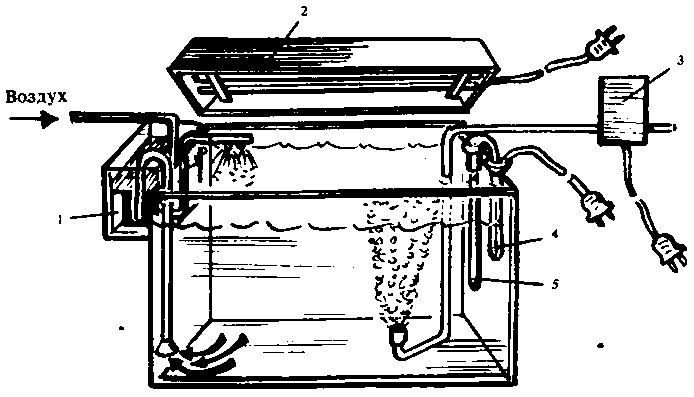 Рис. 5. Аквариум с необходимым оборудованием: 1 наружный фильтр; 2 светильник; 3 компрессор; 4 автомат, включающий обогрев; 5 нагреватель