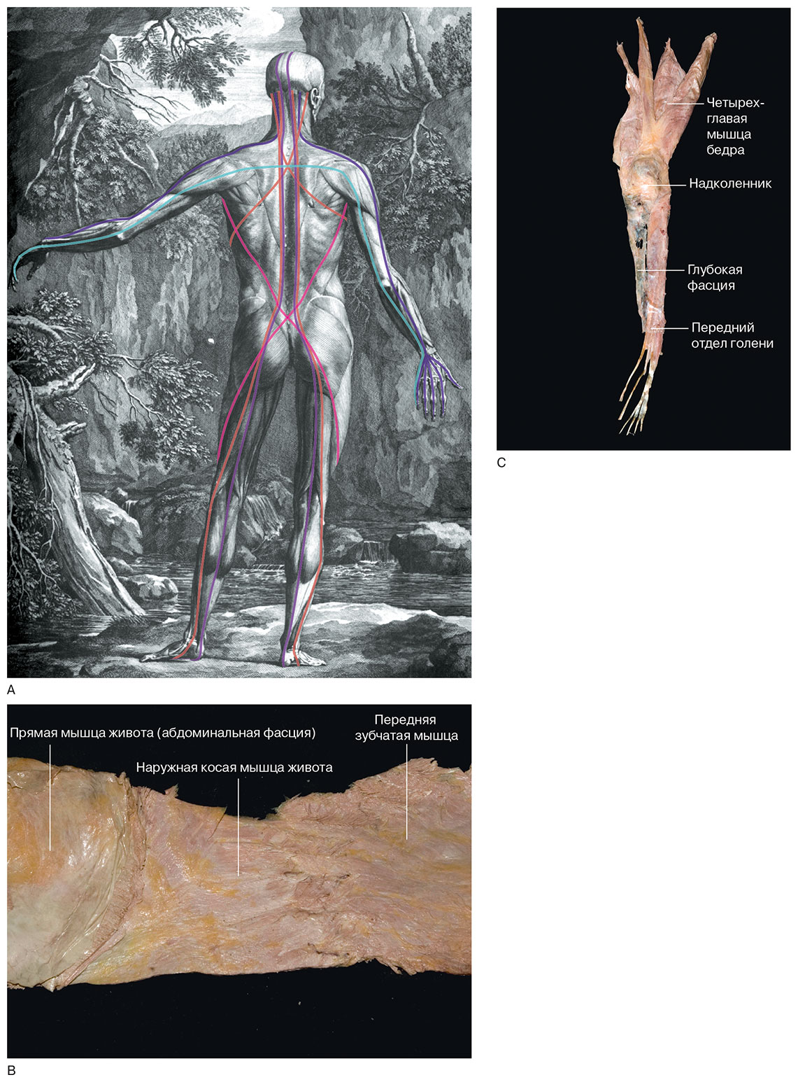 Рис. 2.1. (А) Вид сзади на фигуру Альбина с наложенными на нее линиями миофасциальных меридианов Анатомических поездов (см. также Рис. 1.1А). (В) Диссекция «станции» Анатомических поездов точки прикрепления передней зубчатой мышцы и нижней части наружной косой мышцы живота к ребрам (вид изнутри, если смотреть со стороны ребер). Обратите внимание, как зигзагообразные прикрепления зубчатой и наружной косой мышцы живота вплетаются в надкостницу ребер. Но даже если их отделить от ребер, между этими двумя «путями» сохранится прочная фасциальная непрерывность. (С) Фотография
