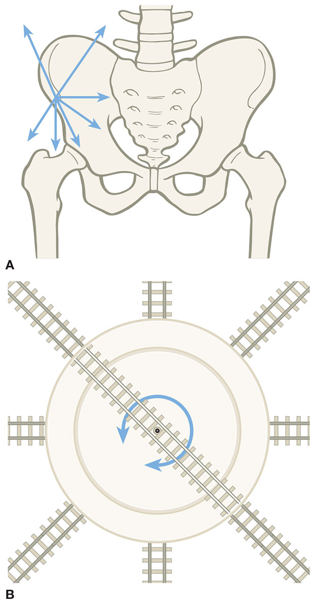 «Депо» это место, где встречаются и/или пересекаются сразу несколько векторов миофасциальной силы; примерами «депо» являются лобковая кость или передняя верхняя подвздошная ость (рис. 2.12). «Депо» нередко являются костными ориентирами миофасциальных «путей». Их положение имеет решающее значение для анализа структуры по схеме Анатомических поездов, так как через них проходят конкурирующие силы натяжения.