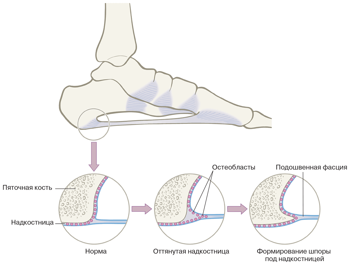 Формирование пяточной шпоры остеобластами, заполняющими костный матрикс под отделившейся надкостницей. Этот рисунок иллюстрирует адаптивность системы соединительной ткани и одно из ограничивающих утверждений упрощенной концепции о том, что «мышцы прикрепляются к костям»