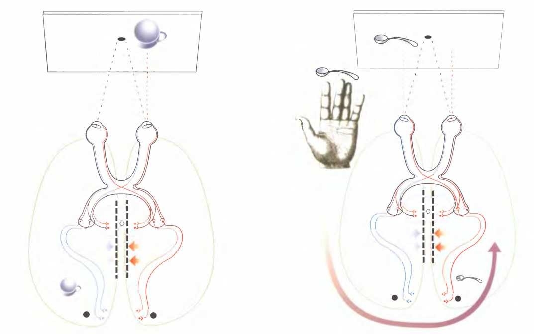 Изображение ложки попадает только в правое полушарие, и поскольку в этом полушарии нет речевого центра, пациент не может сообщить, что видит ее. Однако его левая рука знает, что проецировалось на экран, потому что эта рука связана с правым полушарием.