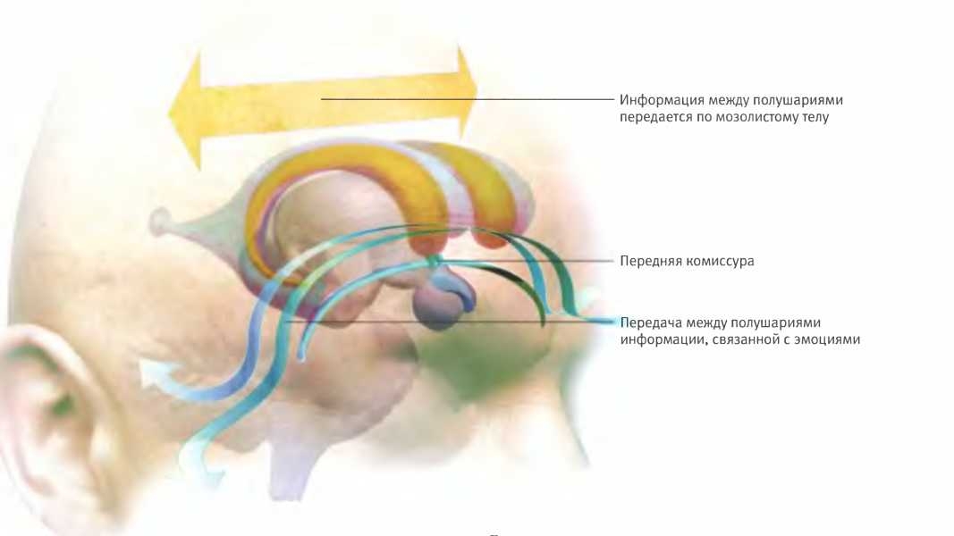 Передняя комиссура располагается под мозолистым телом. Она соединяет бессознательные лимбические структуры обоих полушарий и передает между ними информацию, связанную с эмоциями. Однако она не соединяет сознательные области мозга и поэтому не может обеспечить обмен словами и мыслями.