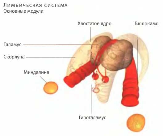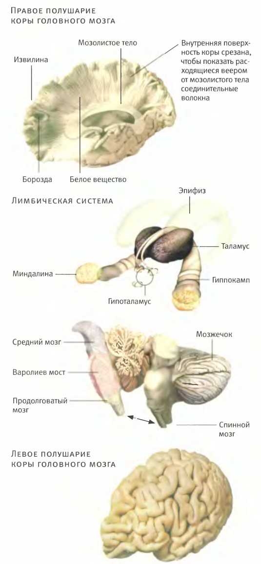 Еще ниже располагается ствол головного мозга. Это самая древняя часть мозга, возникшая более полумиллиарда лет назад и довольно похожая на весь головной мозг современных рептилий. В связи с этим ее часто называют рептильным мозгом. Ствол образован нервами, идущими от тела через позвоночник и передающими информацию о разных частях организма в головной мозг. Скопления клеток в стволе определяют общий уровень настороженности организма и регулируют вегетативные процессы: дыхание, сердцебиение, давление крови и так далее.