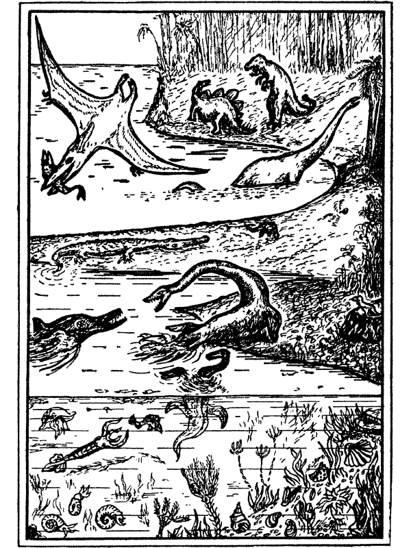 В морях резвятся ихтиозавры, похожие на дельфинов. Плезиозавры вытягивают из волн свои змеино-лебединые шеи. Хищные плезиозавры вспенивают воды, и огромные их пасти с трехгранными зубами наводят ужас на всех плавучих тварей.