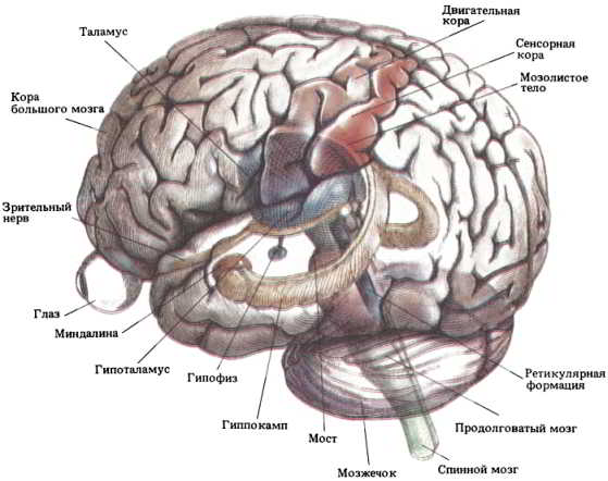 Рис. 20. Нерасчлененный мозг: показаны основные структуры, участвующие в сенсорных процессах и внутренней регуляции, а также структуры лимбической системы и ствола мозга.