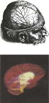 Рис. 1.Представления об организме и мозге менялись, по мере того как ученые овладевали новыми методами исследования. В 1543 г. Андрей Везалий произвел революцию в анатомии, опубликовав труд «De Humani Corporis Fabrica» («О строении человеческого тела») с иллюстрациями художников из мастерской Тициана, которые для своих рисунков использовали в качестве натуры головы казненных преступников (вверху). Обобщенное компьютерное изображение нормального мозга (внизу), полученное в лаборатории Роберта Б. Ливингстона из Калифорнийского университета в Сан-Диего, основано на серии изображений последовательных срезов мозга, разделенных правильными интервалами и заложенных в память компьютера, а затем воспроизведенных в виде трехмерной картины.