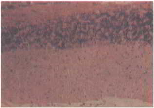 Рис. 16. Слои зрительной коры приматов. При этом очень малом увеличении ядра нервных клеток выглядят как темно-лиловые пятнышки. Шесть основных слоев различаются по плотности расположения нейронов.