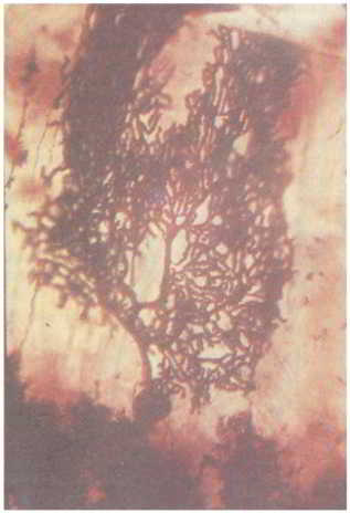 Рис. 17. Нейрон в коре мозжечка взрослой крысы, окрашенный по Гольджи. В результате химической обработки этот крупный нейрон Пуркинье полностью окрасился серебром, чем и объясняется его темное изображение на фоне окружающих клеток. Отчетливо видна очень сложная система дендритов, отходящих от тела клетки.