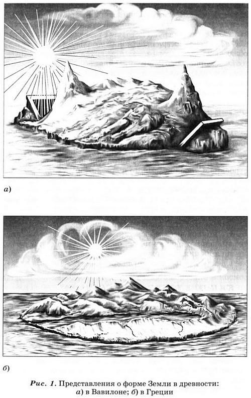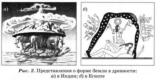 Если бы Земля была шаром, воды стекли бы с нее вниз, люди умерли бы от жажды, а растения засохли. Земля имела и имеет форму плоского диска и омывается со всех сторон величественной рекой, называемой Океан. Земля покоится на шести слонах, а те стоят на огромной черепахе. Вот как устроен мир, о учительница!» (Рис. 2а)