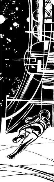 Но вот, преодолев минутное колебание, Батанов решительно отталкивается от стенки ракеты и, отлетев на некоторое расстояние от нее, повисает в пустоте. Тонкий трос связывает человека с ракетой, но висит свободно, не натягиваясь ведь в этом мире тяжести не существует.