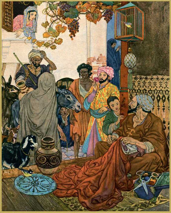 И вот однажды, когда брат мой Бакбук сидел в лавке за своей портняжной работой, он поднял голову и вдруг заметил над собой в верхнем слуховом окне женщину, которая была как луна на своем восходе и которая забавлялась рассматриванием прохожих. Это была жена домовладельца. При виде ее брат мой Бакбук почувствовал, что сердце его преисполнилось страстной любовью к ней, и он не мог более ни шить, ни заниматься чем-либо другим, а все только смотрел в слуховое окошко, и весь этот день до самого вечера провел он в полном одурении и непрерывном созерцании. А на другой день утром, с самого рассвета, он уже сидел на том же месте и, стараясь продолжать начатую работу, все поднимал голову, и при каждом стежке, который он делал иголкою, он колол себе пальцы, ибо взгляд его всякий раз обращался к слуховому окну. Он пребывал в этом состоянии несколько дней, в течение которых ничего не сделал и не заработал ни единой драхмы.