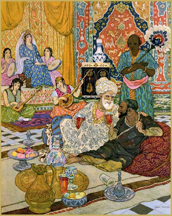 После того как они поели разных кушаний и усладились пирожными, вареньями и фруктами, старик пригласил моего брата перейти с ним в другую залу, предназначенную исключительно для напитков. И при входе они были встречены звуками гармонических инструментов и пением белых рабынь, которые все были краше луны. И в то время как брат мой и старик распивали приятнейшим образом разное тонкое вино, молодые певицы эти не прерывали своего пения и пели на все лады самые пленительные песни с различными переходами и переливами, пели чудеснейшими голосами и с глубоким чувством. Затем самые воздушные из них понеслись в пляске, подобно быстрокрылым птицам, и долго плясали, свежие и благоухающие ароматами. И в этот день праздник закончился поцелуями и восторгами, более упоительными, чем все, что видится во сне.