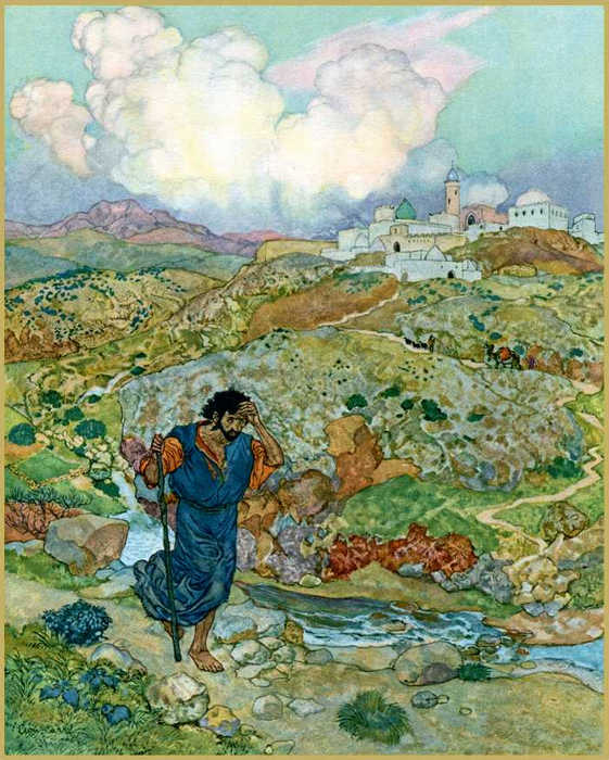 Выйдя из Багдада, он шел и плакал до тех пор, пока сердце его не истерзалось; и шел он целый день, не принимая ни пищи, ни питья.