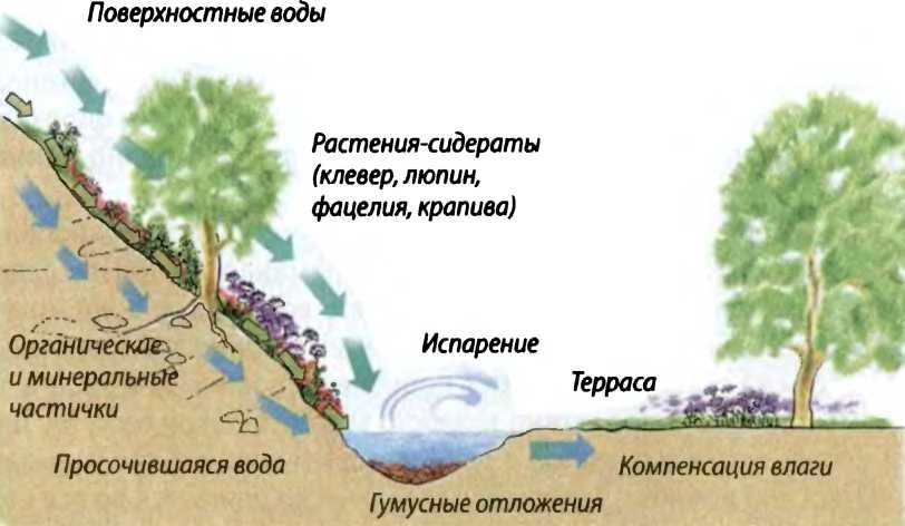 Некоторые такие гумусные ловушки заполнены водой на протяжении всего года, другие, в зависимости от расположения и величины, периодически высыхают. Огромное преимущество, которое они приносят, заключается в том, что при большом количестве осадков поверхностная вода собирает частички гумуса, а с ними и ценные питательные вещества. После понижения уровня воды этот материал легко применить на новых сооружениях, склонах или других культивируемых площадях. Так заготавливается лучший гумус, обогащенный питательными веществами, для буйного роста растений.