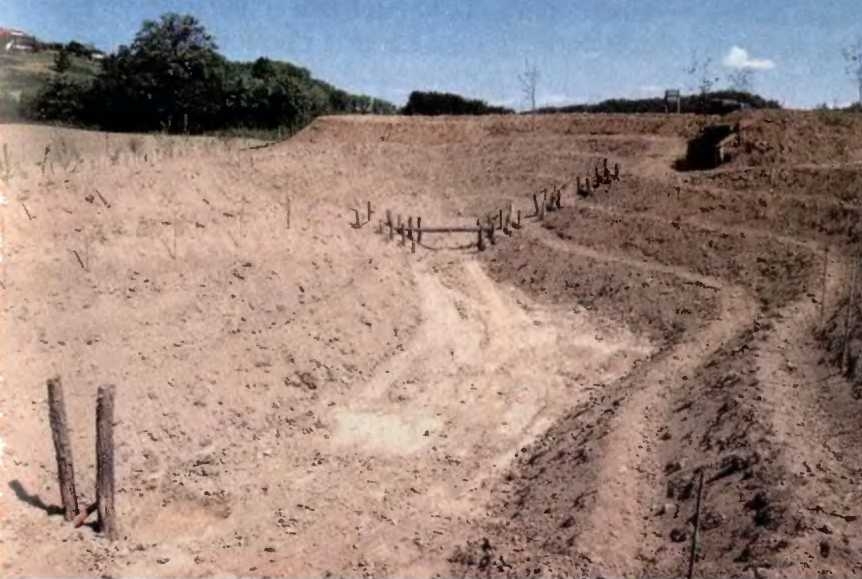 Бассейн для образования гумуса должен быть слегка наклонён в гору по всей длине поверхности. Как уже упоминалось при закладке террас, здесь тоже важно не канализировать воду, иначе вода может нанести ущерб. Благодаря же наклону по всей ширине это предотвращается. Если на склоне уже имеется подобие котловины или оврага, то при помощи экскаватора можно запросто заложить такой бассейн. Для этого используется экскаватор с двухметровым ковшом, так называемой «Откосной ложкой», который гидравлически двигается во все стороны. Зачастую даже не нужно копать достаточно продавить в почве углубление дном «ложки».