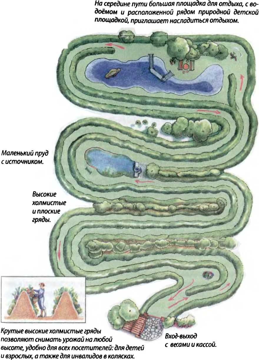 Поездка за продуктами превратится во вкусную прогулку, дарящую прекрасные ощущения для всех органов чувств. Планировка «Страны урожая» даёт большую свободу для воплощения собственных идей. Один из вариантов: примерно на половине пути находится площадка для отдыха рядом с водяным садом прекрасная возможность сделать остановку. Здесь же можно расположить спираль с травами, где посетители могут сорвать свежие травы для принесённого с собой обеда. На детской площадке для игр и приключений, находящейся рядом, сделанной из природных материалов, дети могут вдоволь наиграться на стволах деревьев, в берлогах и шалашах из ив.