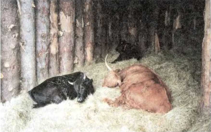 Шотландская высокогорная корова и карликовые коровы породы Дахоми в земляном стойле.