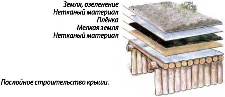 В заключение крыша покрывается плёнкой, нетканым материалом и присыпается землёй в следующей последовательности: сначала я кладу нетканый материал на брёвна, затем насыпаю на него немного земли, чтобы выровнять пустоты между брёвнами. К тому же, за счёт выравнивания поверхности можно управлять стоком воды. Теперь на землю настилается плёнка. При этом важно не повредить её. Поэтому земля под плёнкой ни в коем случае не должна быть с камнями. Для этой цели лучше всего подойдёт плёнка для водоёмов, так как она намного долговечнее. В заключение на плёнку, для надёжности, настилается ещё один слой нетканого материала. Нетканый материал и плёнка ни в коем случае не должны быть натянуты, поскольку могут порваться изза большой тяжести насыпи. И наконец крыша засыпается землёй. Высота насыпи, в зависимости от почвы, различна, но она не должна превышать полуметра. Глинистые почвы особенно тяжёлые, поэтому насыпь должна быть меньше. В процессе, конечно же, засыпаются снаружи и боковые стены. Для того чтобы придать строению законченный вид, можно по бокам поставить стеныкрылья. Они, к тому же, дополнительно стабилизируют боковую насыпь.