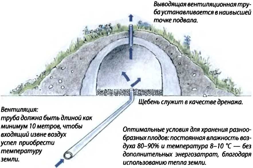 При строительстве подвалов, предназначенных только для хранения овощей и фруктов, следует учитывать некоторые детали. Очень важно, чтобы была хорошая вентиляция. Для дренажа на пол насыпается щебень. Вентиляционные трубы должны быть такого размера, чтобы обеспечить данное помещение достаточным количеством кислорода. Трубы длиной 10 метров в мой каменный подвал я прокладываю под землёй, на глубине одного метра. Проходя по трубам, воздух успевает приобрести температуру земли. Если температура воздуха, попадая снаружи, не совпадёт с температурой воздуха внутри, то в подвале может произойти нежелательное падение температуры. Вследствие чего образуется конденсат. Падающая сверху вода вызывает гниение продуктов и образование плесени. Также и диаметр труб, выводящих воздух наружу, должен соответствовать величине помещения. Например, для земляного подвала площадью в 100 м2 я использую трубы для вентиляции диаметром минимум 15 см.