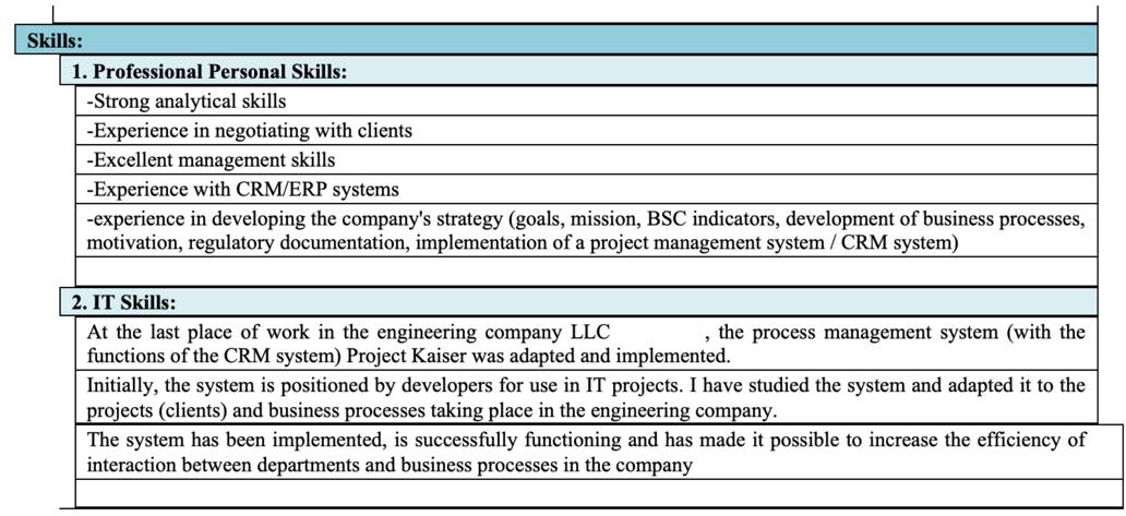 Это было моё первое резюме, когда я устраивался в ИТ компанию впервые, о которой я упоминал несколько страниц назад. В этом резюме я допустил ошибки по всем ранее обсужденным аспектам. Однако был позитивный момент: знакомый, который помогал мне с трудоустройством, посоветовал мне адаптировать резюме в соответствии с требованиями к должности. Хотя у меня не было опыта в ИТ-секторе, я выделил те аспекты, которые были важны для позиции, на которую я претендовал. Ниже приведён пример, где я добавил раздел 'ИТ навыки' (IT Skills) и указал не только ИТ-навыки, но и другие качества, применимые к должности бизнес-аналитика, такие как аналитические навыки, опыт взаимодействия с клиентами и знание CRM/ERP систем: