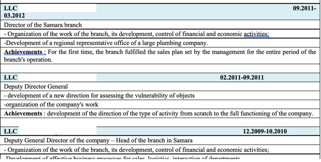 Примечание автора: пример резюме на английском языке. Перевод не требуется на изображении перечислены места работы и смысловое описание указано выше.